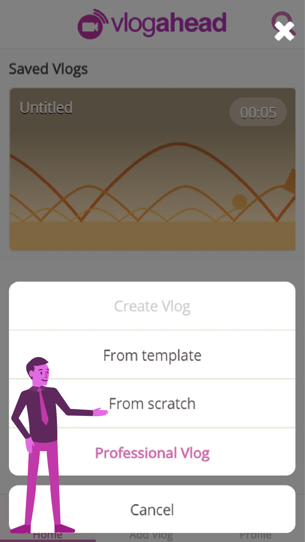 Pressing the button “add vlog” gives you a couple of options to choose from. For now choose the option “from scratch”.