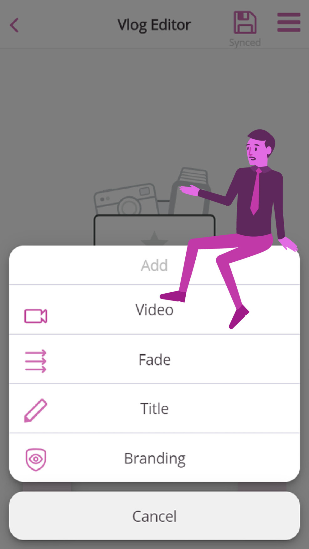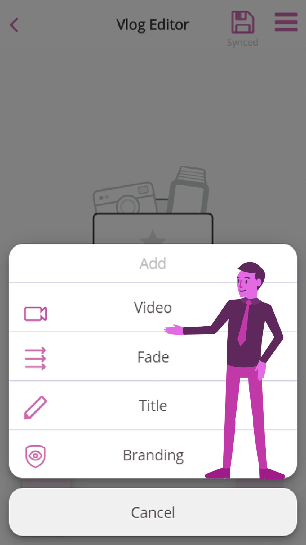 The options displayed here are “video” (record a video or pick a video from your folders), “fade” (choose a transition for inbetween different clips), “title” (add a title to a video clip) and “branding” (add branded content like for example a logo animation of your company).
