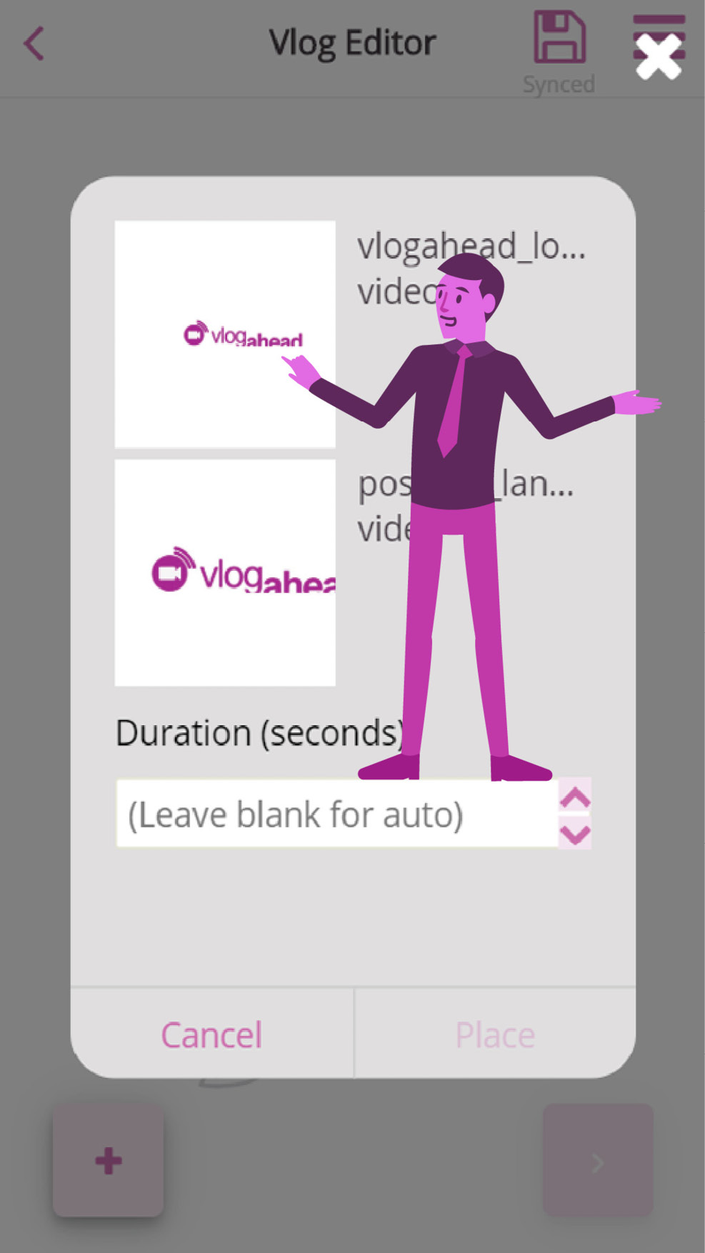 By pressing this button you can add branded content, like a logo animation of your company. Press the “place” button to place your branded content in the “vlog editor”.