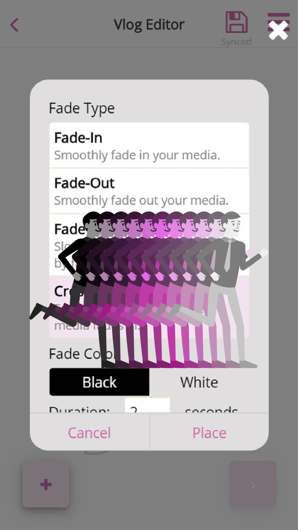 Select the fade you would like to use. Press the “place” button, and the fade will be placed in the “vlog editor”.
