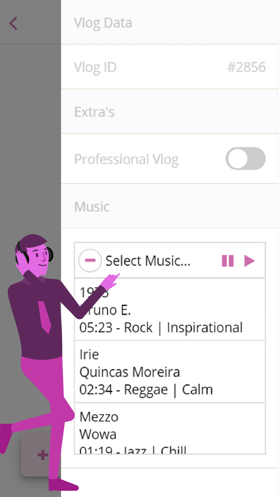 To do so, you must go to the “hamburger menu” in the top left corner of the “vlog editor”. After pressing this you can see a list of songs to choose from. Choose the song you would like to add and go back to the vlog editor.