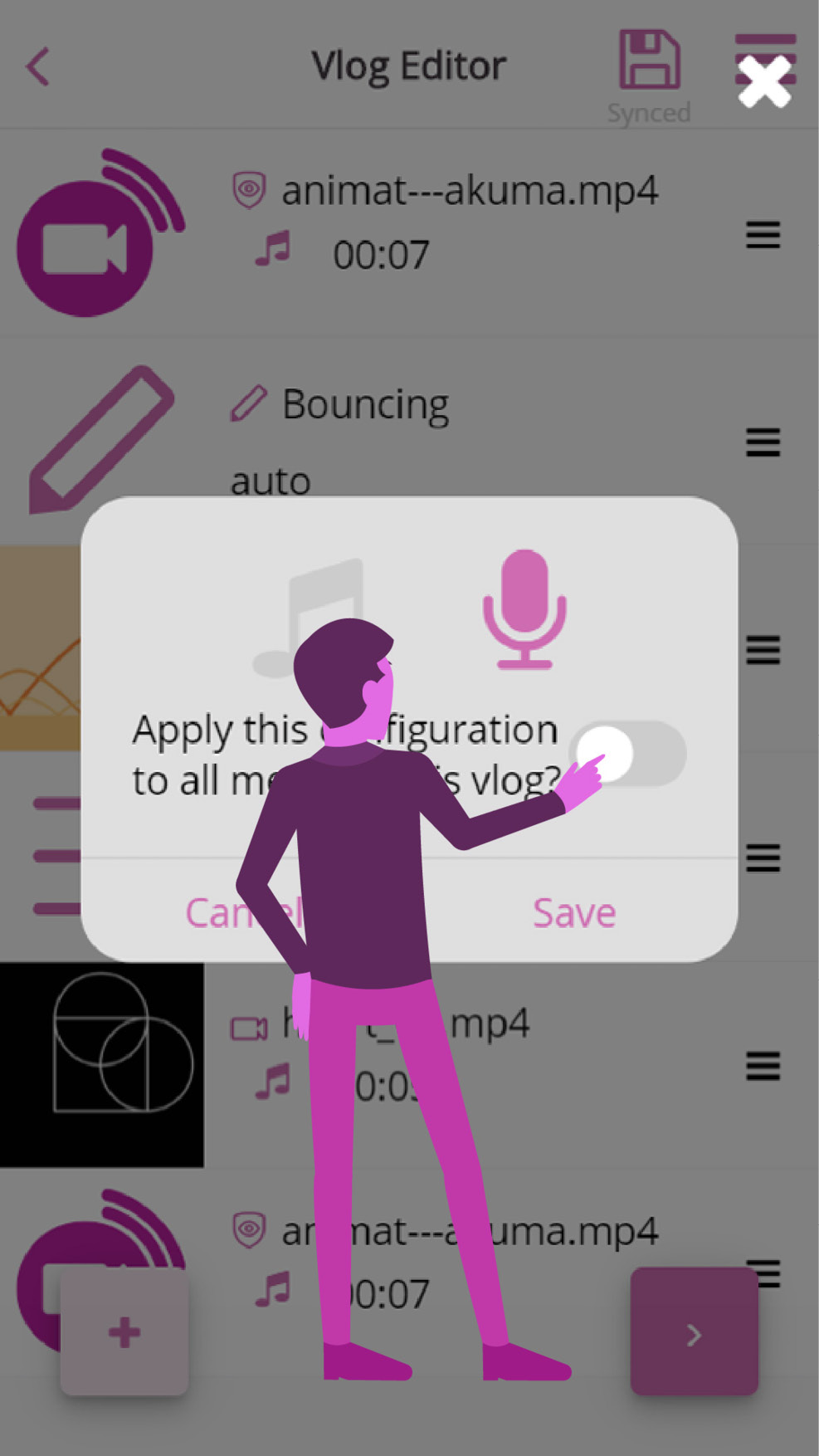 A small pop-up will appear. All you have to do here is push the button that says “Apply this configuration to all media in this vlog”, and make sure the music icon is lit up (just like the microphone icon in the example). Press “save” to continue.